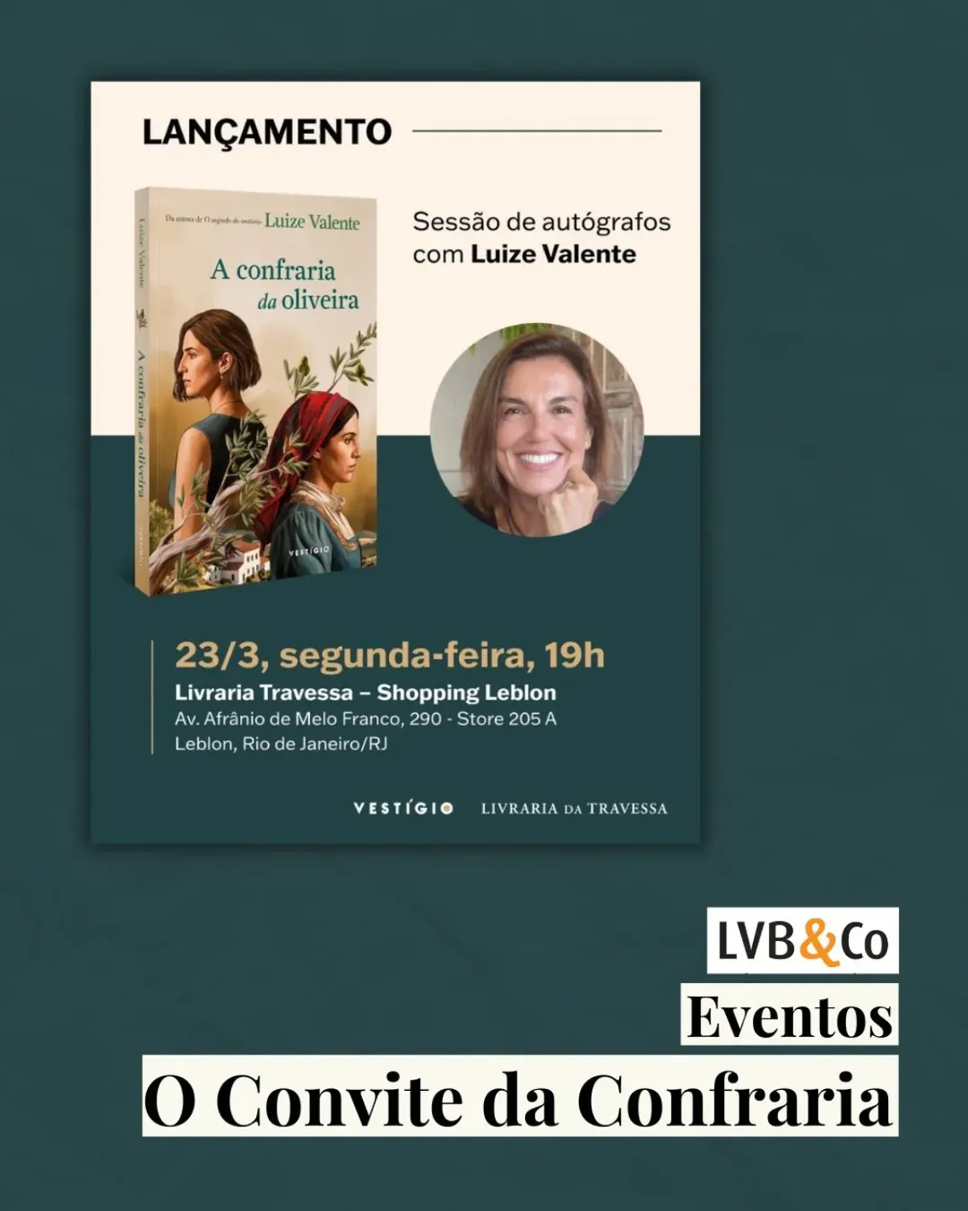 Ficou pronto o convite para os autógrafos de A Confraria da Oliveira, novo romance de Luize Valente (@luizevalente ). Ela está