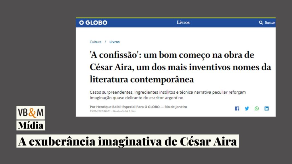 Saiu resenha em O Globo sobre A CONFISSÃO, do argentino César Aira, recém-lançado pela Papéis Selvagens. No texto, o jornalista
